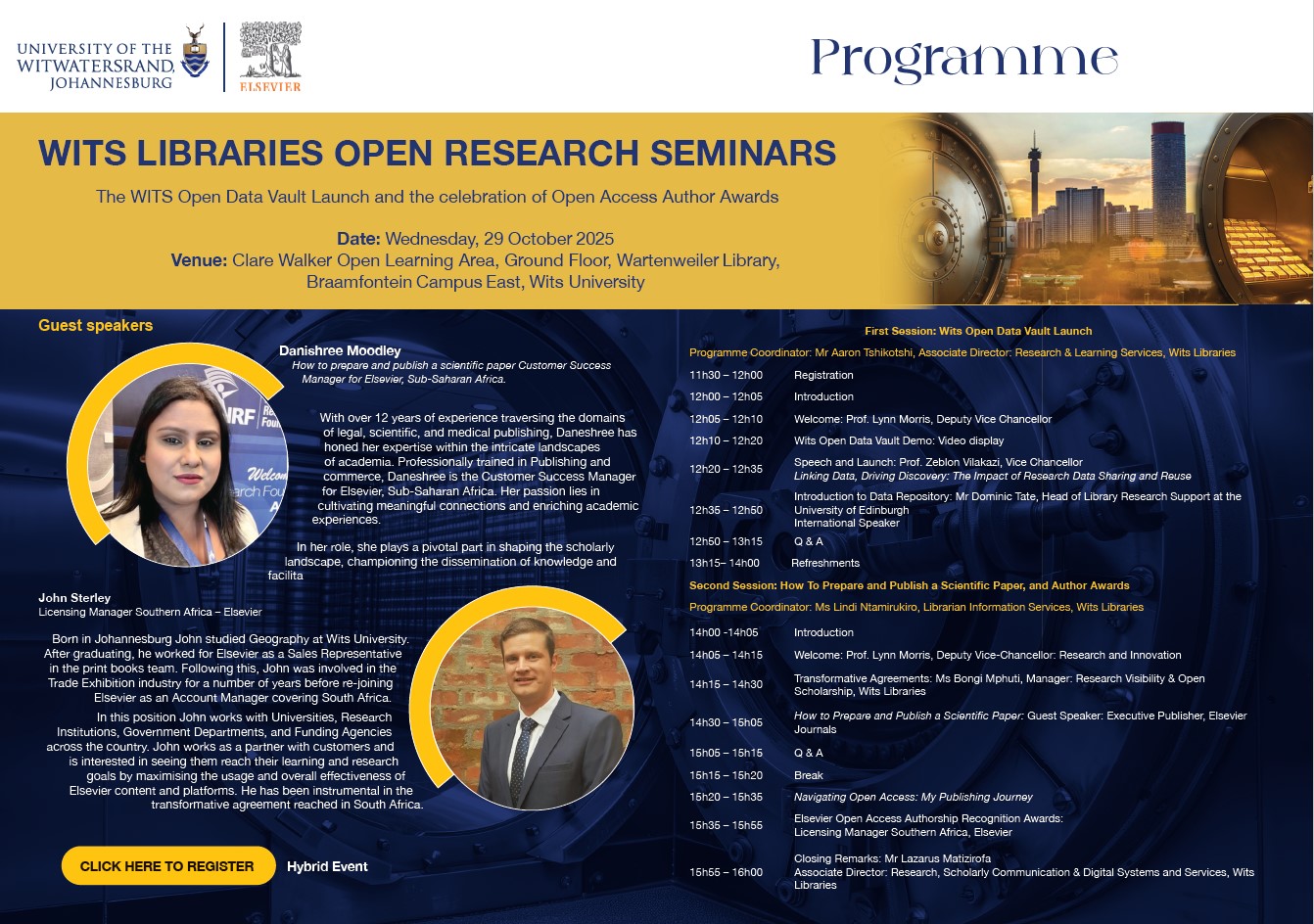 This training programme equips postgraduate students with advanced information literacy skills to locate, evaluate, and use library resources for research and scholarly writing. It fosters independent research and ethical information use, enhancing critical thinking and analytical abilities. The Wits University Library provides essential collection resources to support research alongside knowledgeable staff to support discovery, FAIR/CARE approaches to manage your data, scholarly publishing advice, and preservation of your research outputs.