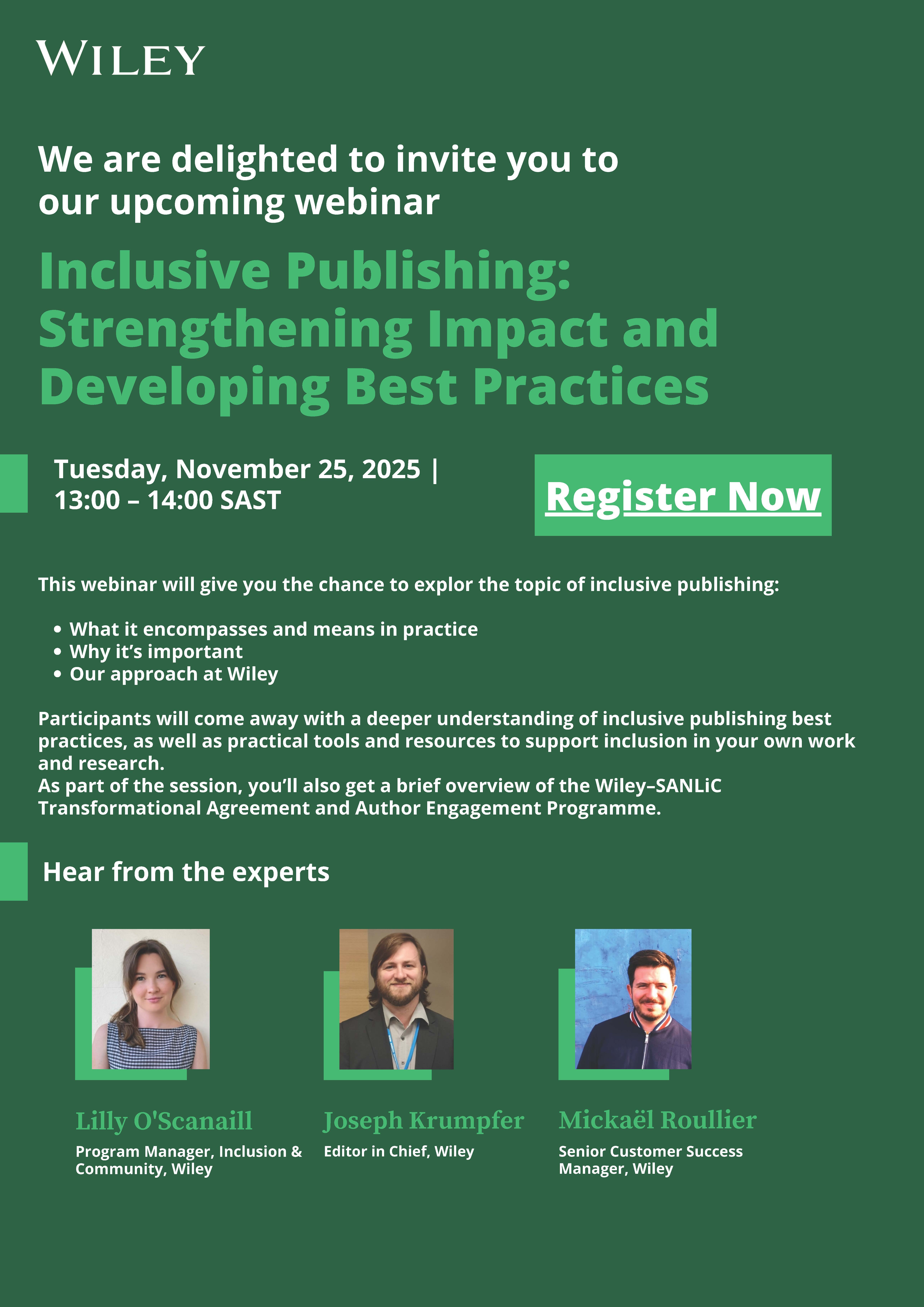 Wits Libraries would like to invite you to the Wiley Webinar. Inclusive Publishing: Strengthening impact and developing best practices.