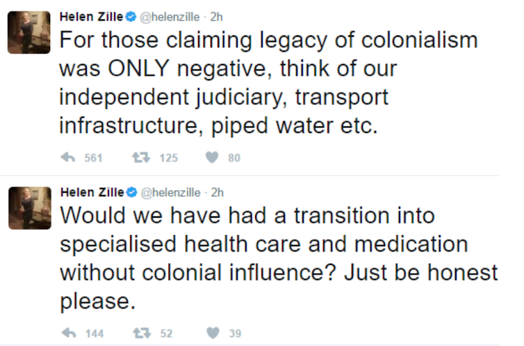 It would seem that this is the major point that Zille wants to make in her various tweets and more extended comments about colonialism. She will claim that she is not defending colonialism, and the racism inherent in it, but pointing out that, like God, it moves in a mysterious way.