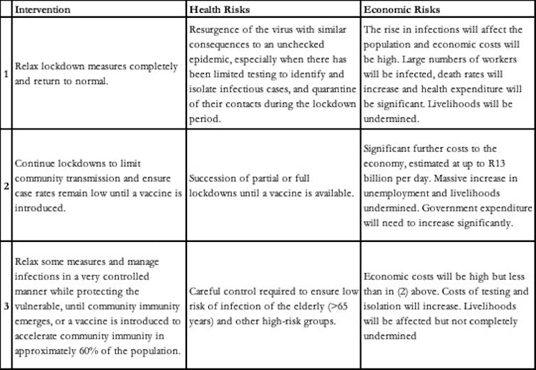 South Africa’s health and economic strategy beyond the current lockdown must be designed to ensure good health care and be economically sustainable. We argue that the country needs to transition to a risk-based strategy which offers effective health protection and allows for the resumption of some economic activity.
