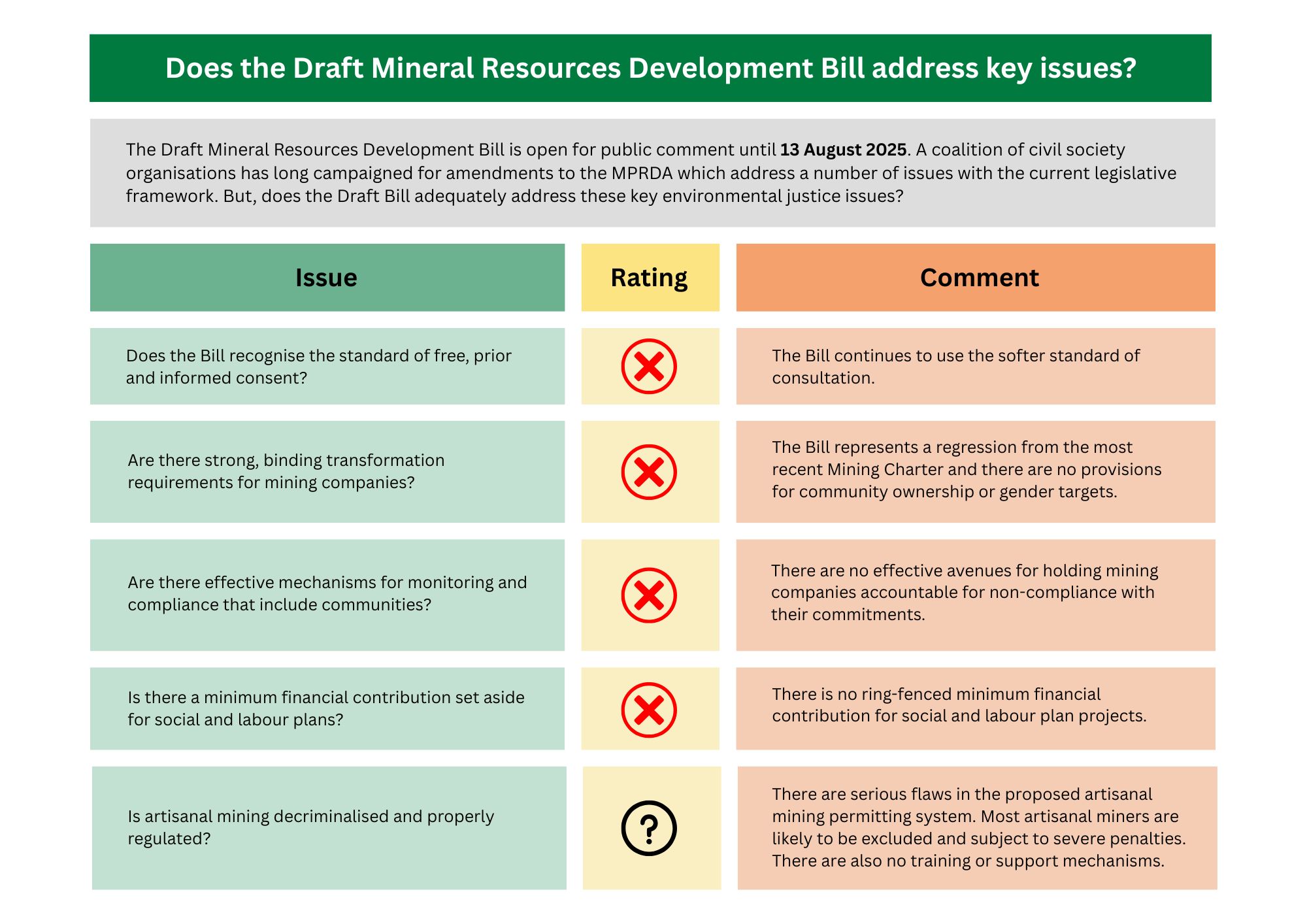 In May this year, the Department of Mineral and Petroleum Resources (DMPR) published the Draft Mineral Resources Development Bill for public comment. Communities, civil society organisations and the South African Human Rights Commission have long called for reforms to the Mineral and Petroleum Resources Development Act (MPRDA) to address key environmental justice issues.
