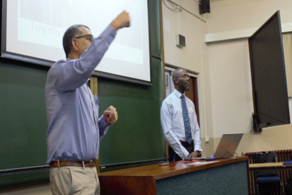 |  Prof. Ballim and Prof Ilemobade addressing the cohort |  Cohort listening to the address in the lecture room |