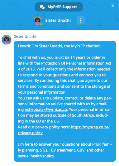 To meet these expectations, the AI-powered omnichannel Sister Unathi chatbot is a digital tool designed to provide discreet, accessible support across multiple platforms that young people already use, including WhatsApp, Facebook Messenger, Instagram, and the MyPrEP website.